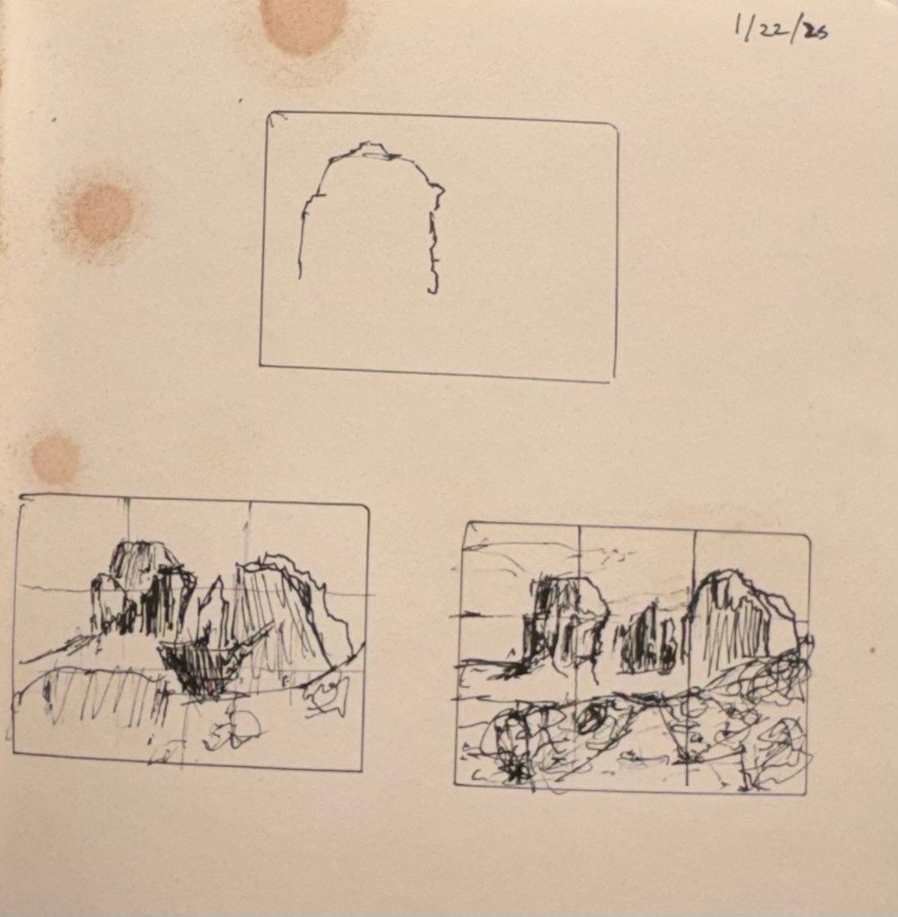 The sketch in the bottom-left is the next one I tried and while the shapes were good, I wasn’t satisfied with the foreground and felt that I had slightly squished the rock on the right.
